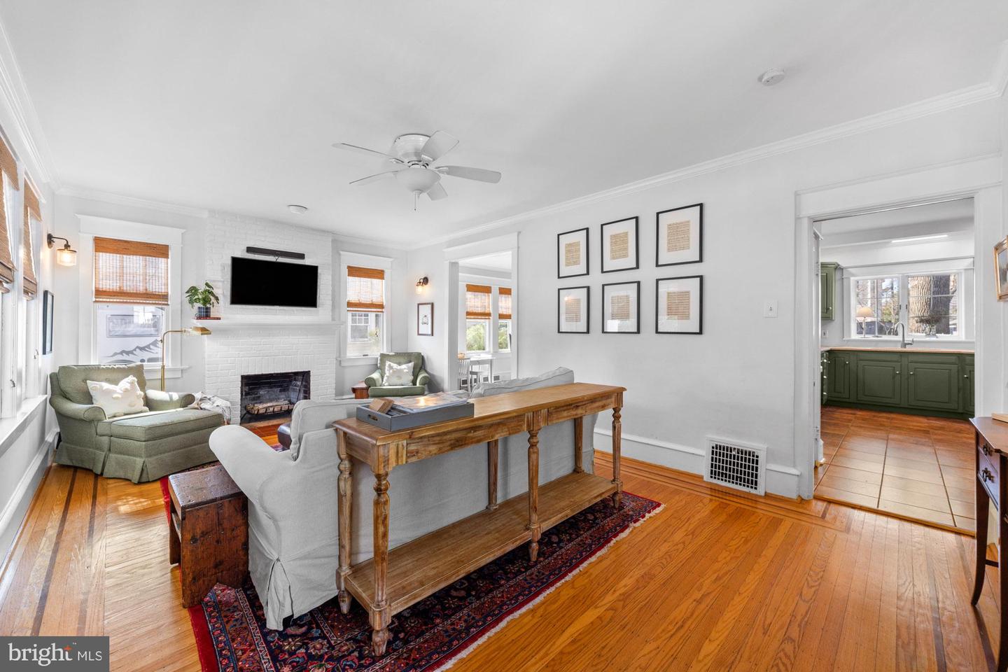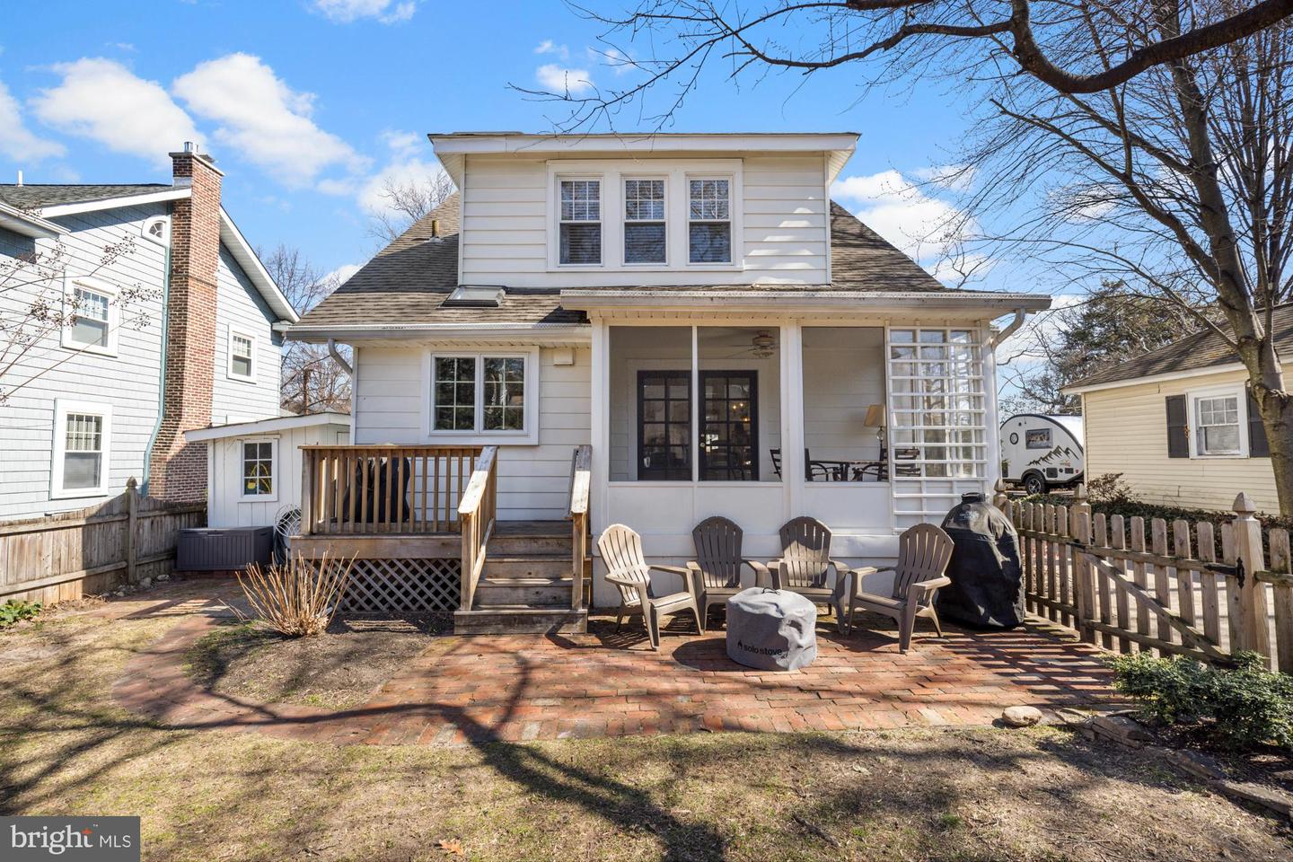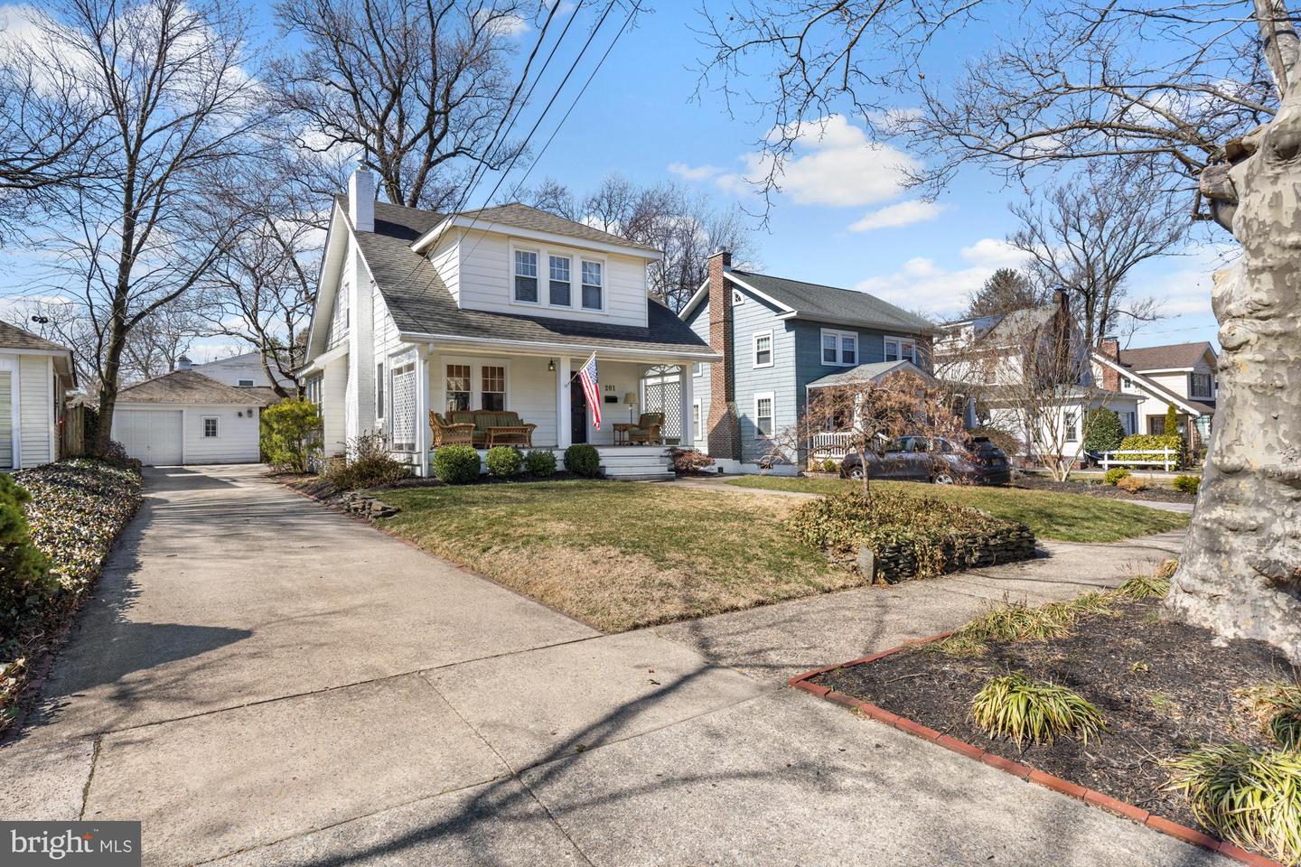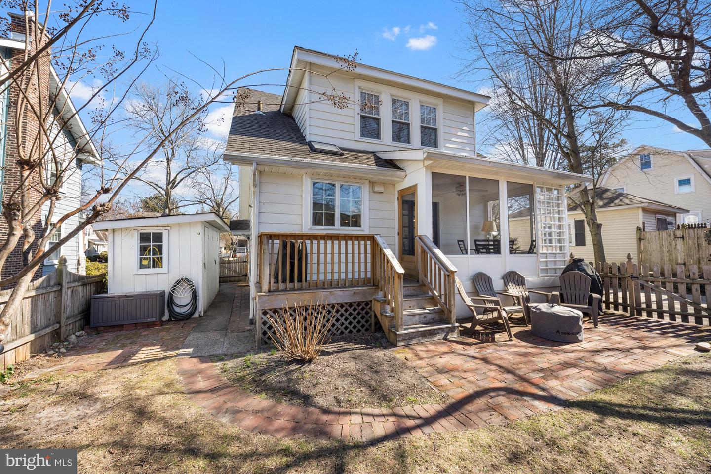 Nestled in the heart of Haddon Township's cherished Bluebird neighborhood, this charming home exudes an immediate sense of warmth and belonging. Situated on a tree-lined street just a block from Cooper River Park and the newly revamped New Jersey Park Playground, it's an ideal spot for families seeking a welcoming, community-oriented environment. The home greets you with a large, open front porch and original sunrise windows that set a delightful tone. Step inside to a bright front room anchored by a wood-burning fireplace with a brick surround, complemented by built-in sconces, oak floors with intricate inlaid details, and double sash windows with paneled tops. Throughout the house, original paneled doors with brass hardware blend seamlessly with modern updates like recessed lighting, creating a harmonious mix of old and new. The spacious kitchen shines with stainless steel appliances and stylish brushed adjustable pendants illuminating the breakfast bar, while skylights on both the first and second floors bathe the freshly painted interiors in warm, natural light. The dining room, with its oversized windows and French doors opening to a screened-in porch complete with a ceiling fan, offers a perfect setting for shared meals and gatherings.