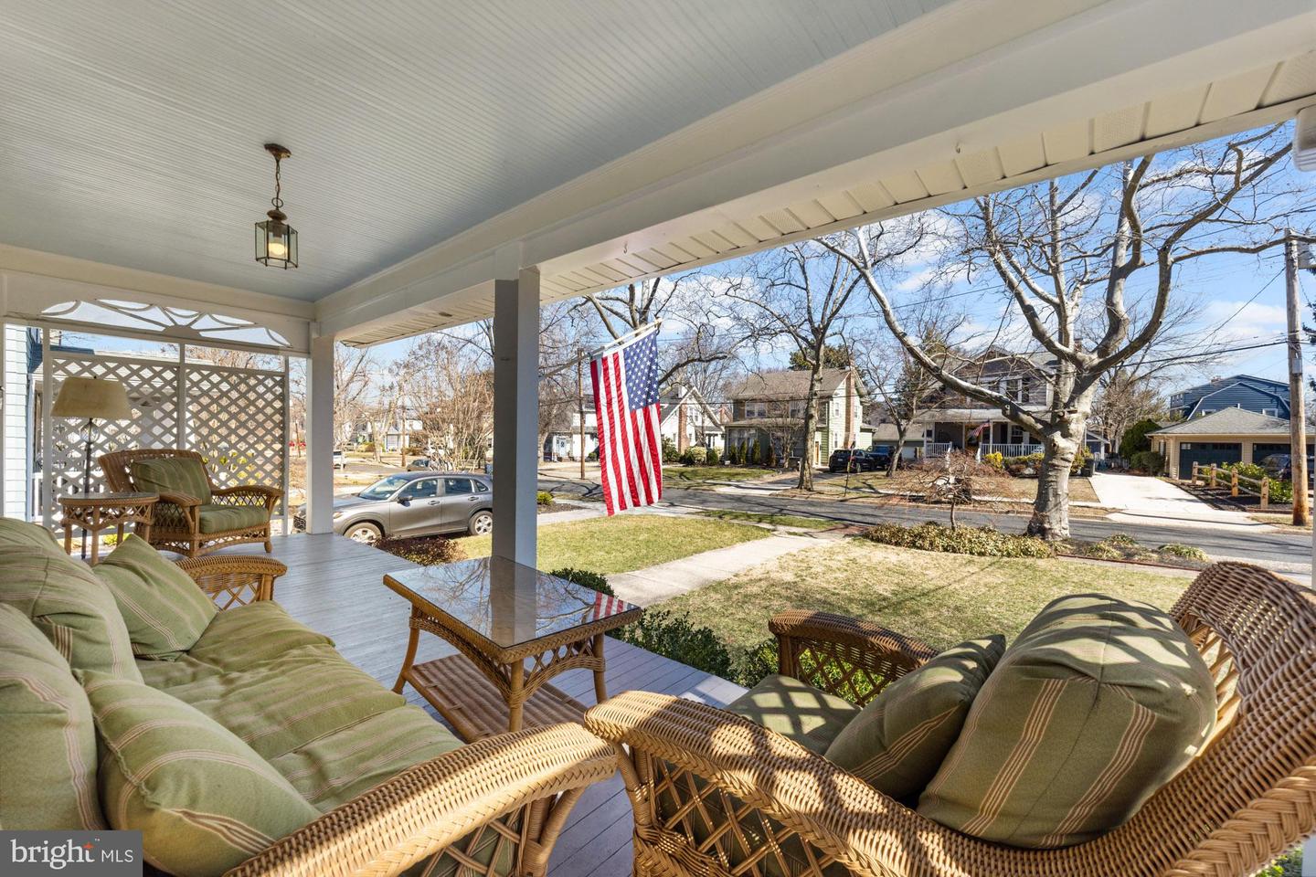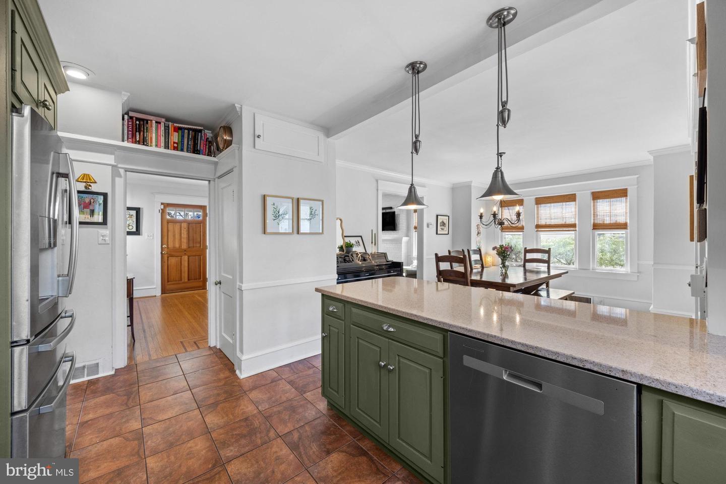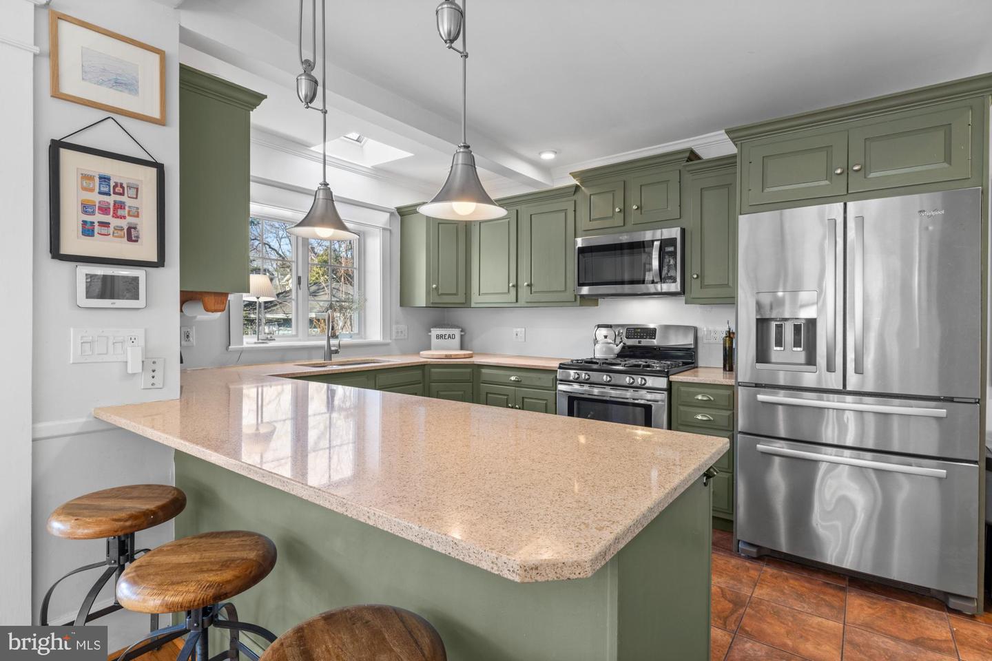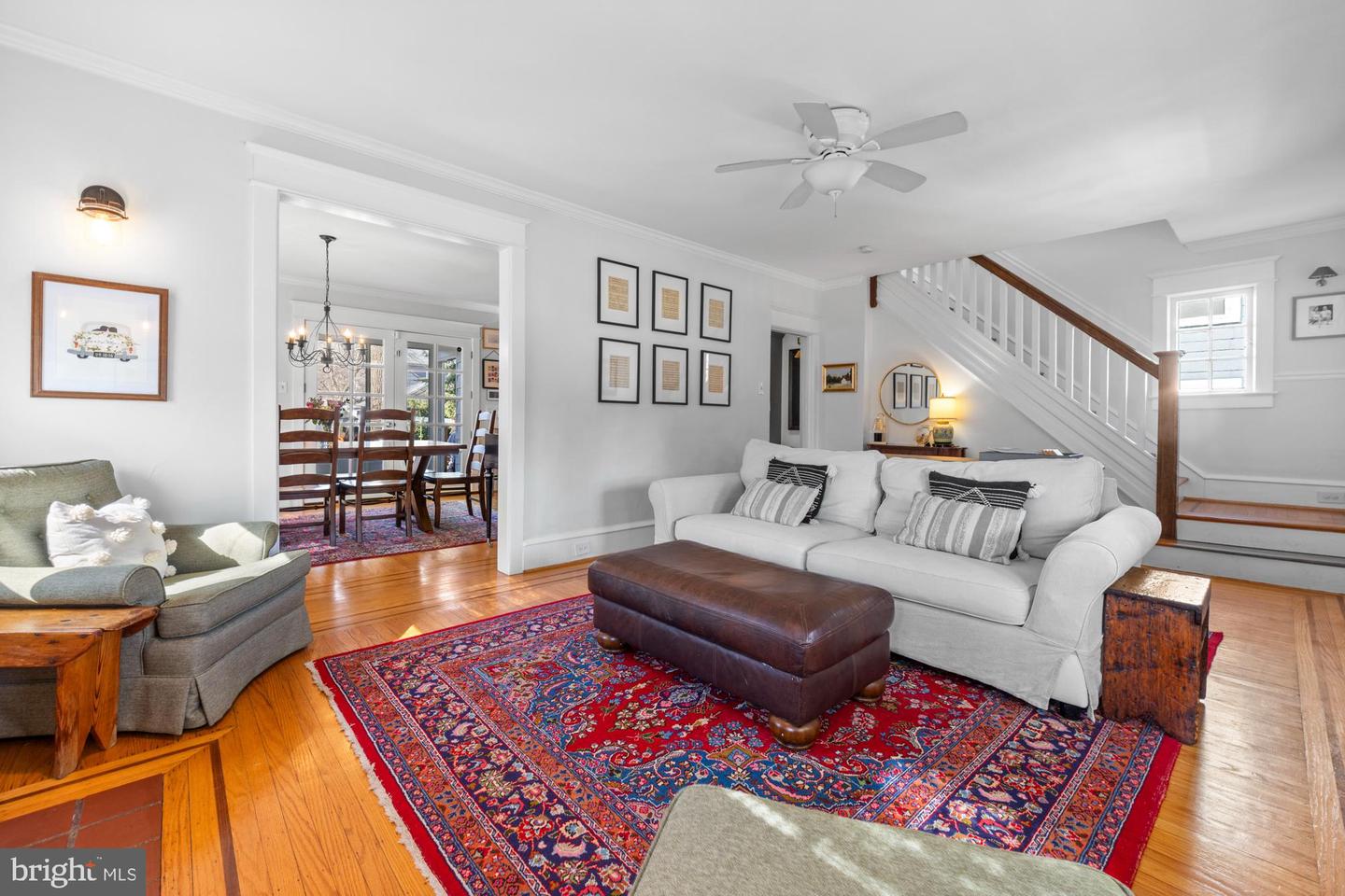 Nestled in the heart of Haddon Township's cherished Bluebird neighborhood, this charming home exudes an immediate sense of warmth and belonging. Situated on a tree-lined street just a block from Cooper River Park and the newly revamped New Jersey Park Playground, it's an ideal spot for families seeking a welcoming, community-oriented environment. The home greets you with a large, open front porch and original sunrise windows that set a delightful tone. Step inside to a bright front room anchored by a wood-burning fireplace with a brick surround, complemented by built-in sconces, oak floors with intricate inlaid details, and double sash windows with paneled tops. Throughout the house, original paneled doors with brass hardware blend seamlessly with modern updates like recessed lighting, creating a harmonious mix of old and new. The spacious kitchen shines with stainless steel appliances and stylish brushed adjustable pendants illuminating the breakfast bar, while skylights on both the first and second floors bathe the freshly painted interiors in warm, natural light. The dining room, with its oversized windows and French doors opening to a screened-in porch complete with a ceiling fan, offers a perfect setting for shared meals and gatherings.