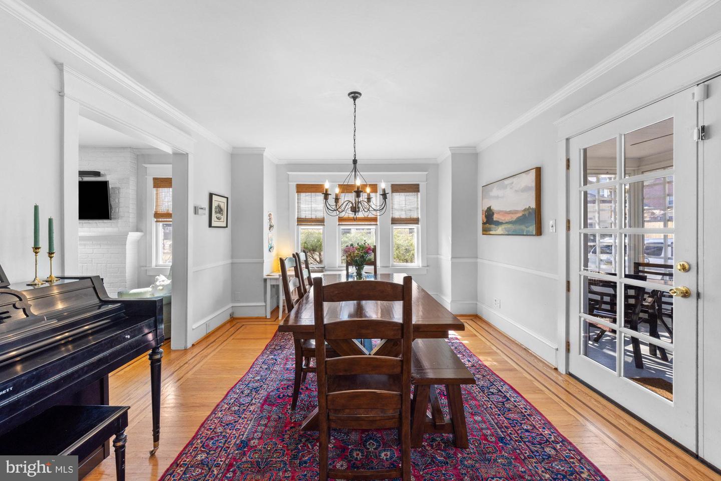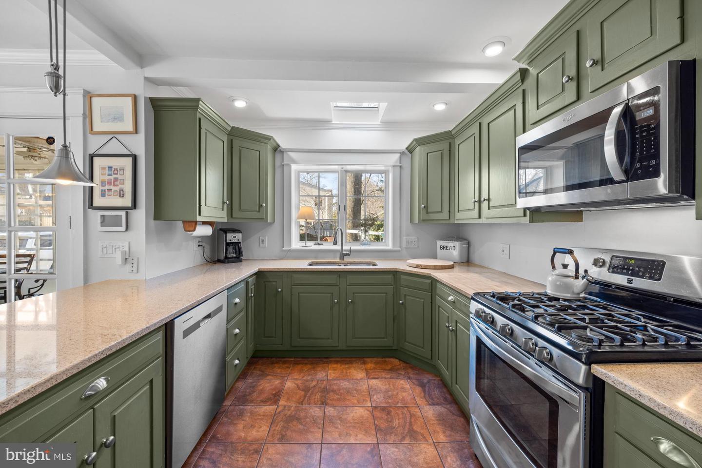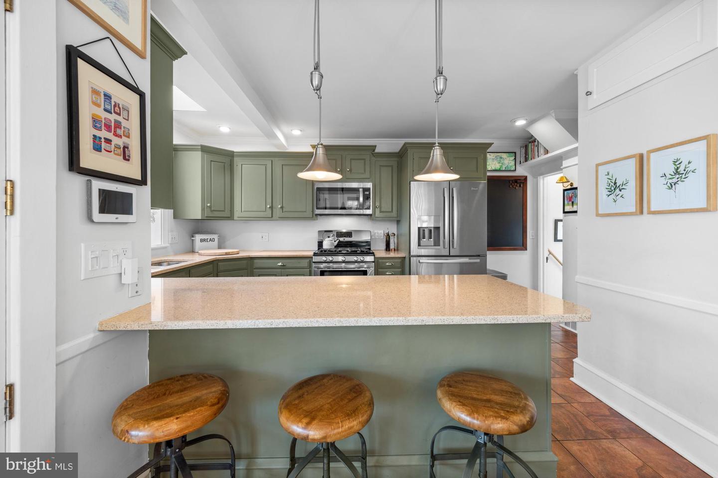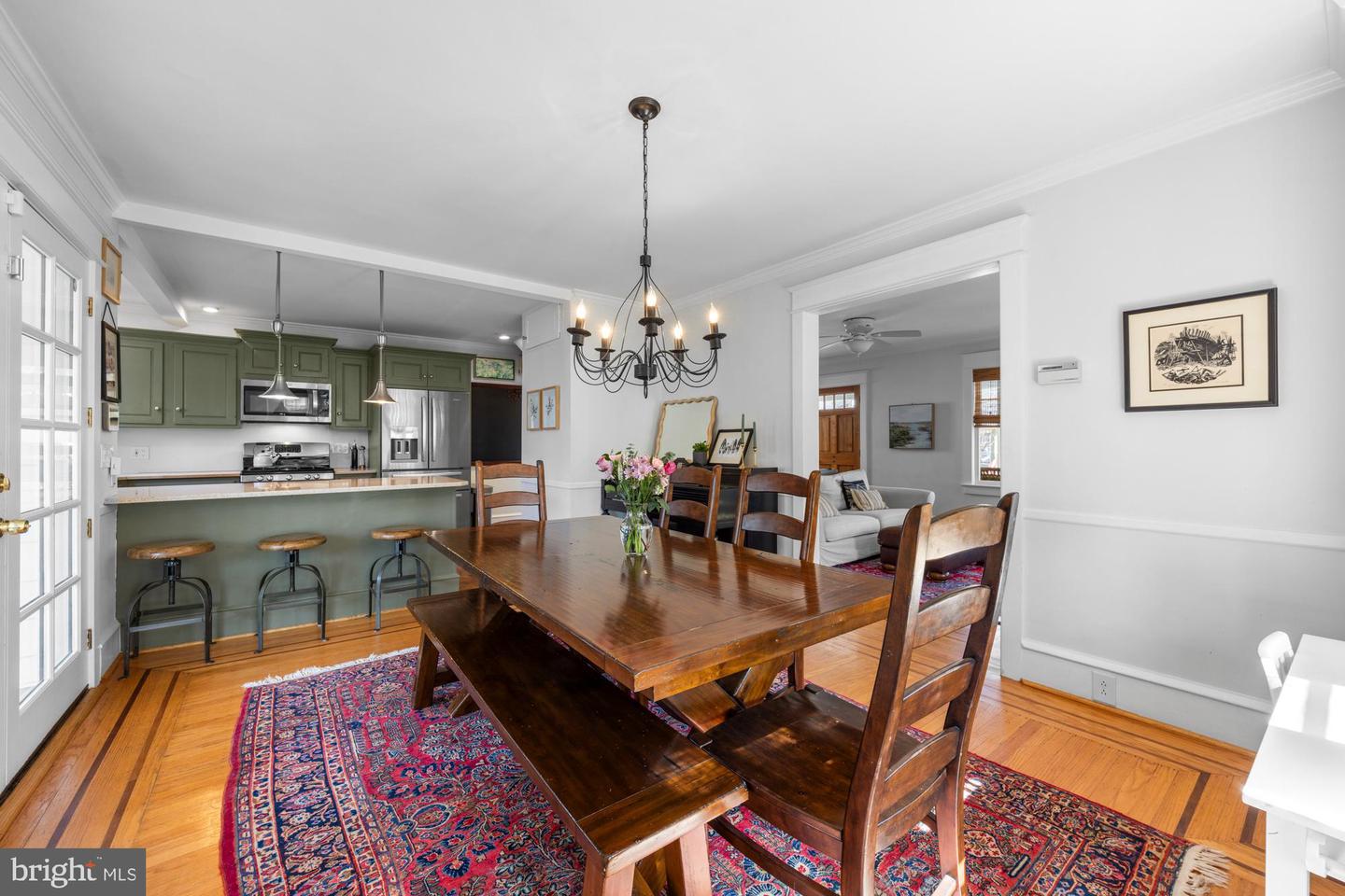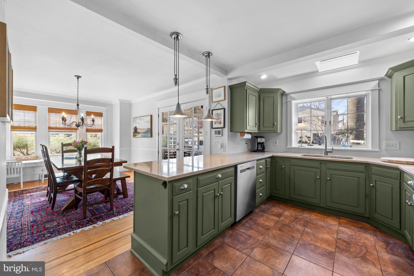 Nestled in the heart of Haddon Township's cherished Bluebird neighborhood, this charming home exudes an immediate sense of warmth and belonging. Situated on a tree-lined street just a block from Cooper River Park and the newly revamped New Jersey Park Playground, it's an ideal spot for families seeking a welcoming, community-oriented environment. The home greets you with a large, open front porch and original sunrise windows that set a delightful tone. Step inside to a bright front room anchored by a wood-burning fireplace with a brick surround, complemented by built-in sconces, oak floors with intricate inlaid details, and double sash windows with paneled tops. Throughout the house, original paneled doors with brass hardware blend seamlessly with modern updates like recessed lighting, creating a harmonious mix of old and new. The spacious kitchen shines with stainless steel appliances and stylish brushed adjustable pendants illuminating the breakfast bar, while skylights on both the first and second floors bathe the freshly painted interiors in warm, natural light. The dining room, with its oversized windows and French doors opening to a screened-in porch complete with a ceiling fan, offers a perfect setting for shared meals and gatherings.